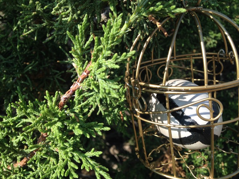 At our campground in Santa Fe I saw several of these eggs in birdcages hanging in trees and on fences. The ones I saw were off the beaten path and sort of hidden. The eggs were all painted differently, though they were all black and white. Not sure of the significance…
