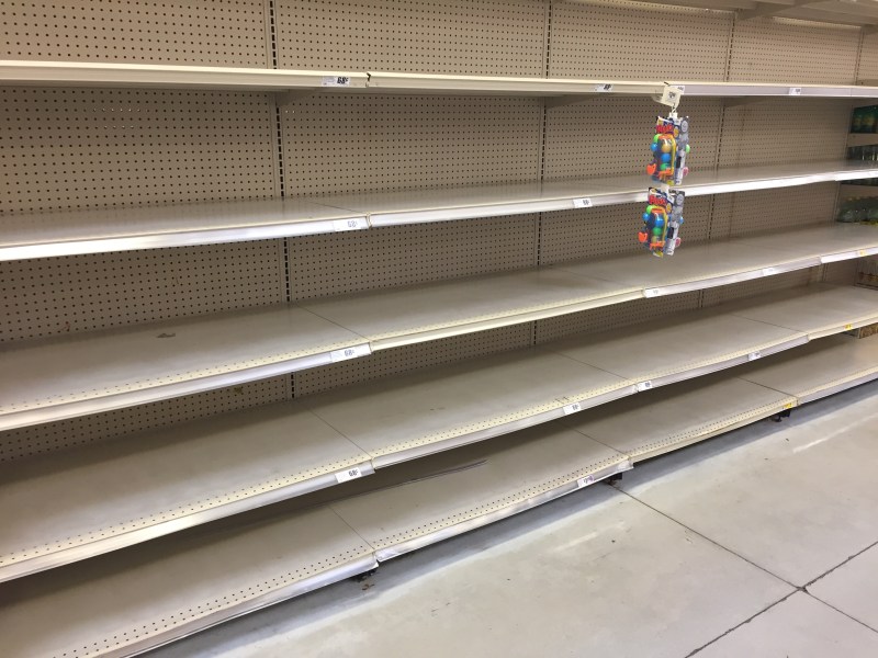 This is a photo of the shelves at our grocery store. I guess everyone is getting ready for the hurricane. Expected to make landfall 24 hours from now, 150 miles from here.