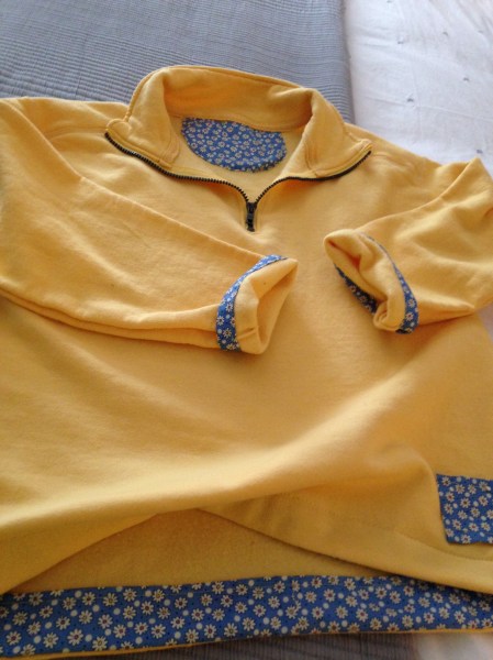 I purchased an inexpensive quarter-zip sweatshirt from Hanes ($14!). Cut off the ribbing at the sleeves and hem. Then added fabric binding and a couple other embellishments to make it my own.