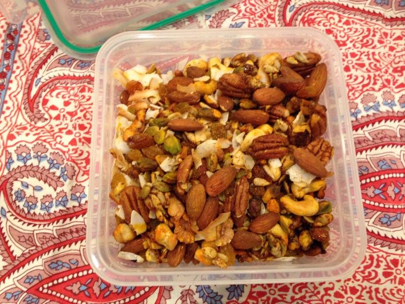 Mix 1/2 cup each raw almonds, cashews, walnuts and pistachios. Spray generously with olive oil. Season with one teaspoon each curry powder and chili powder. Salt to taste. Bake in a single layer 350 degrees for 4 minutes.
