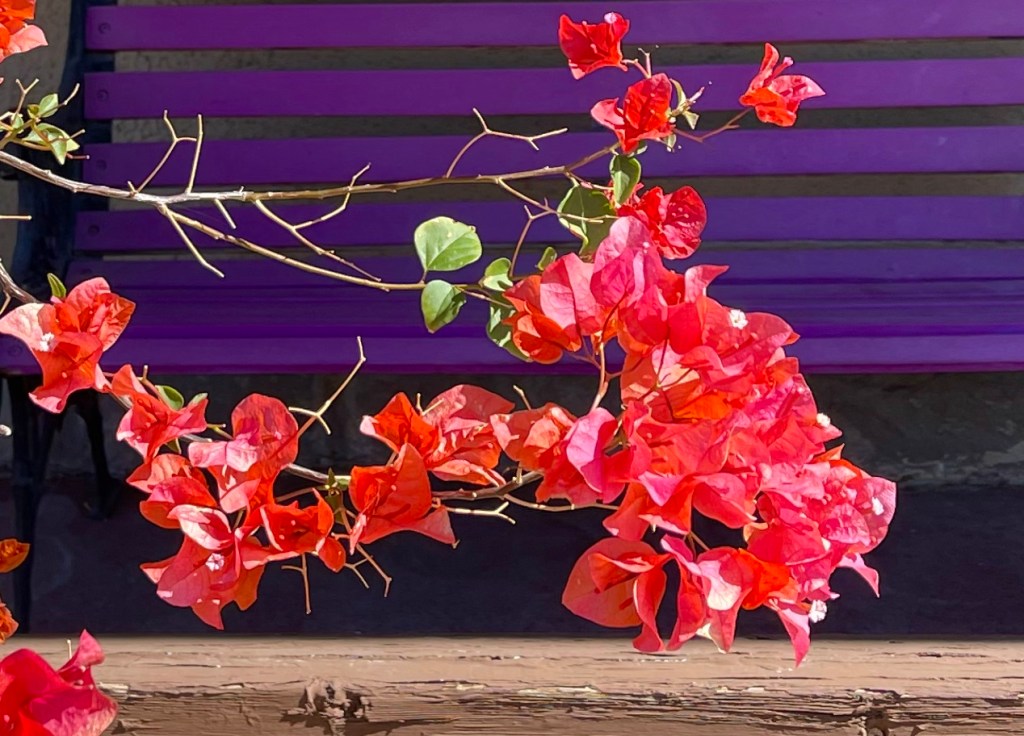 Bougainvillea and bench, a beautiful front porch pairing. Seen near the Tucson Museum of Art.